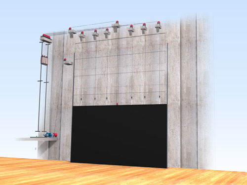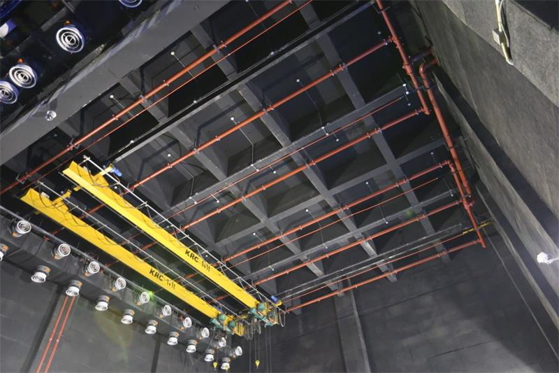 側臺裝景行車位于左右兩側側舞臺上空。行車用于大型或重型布景部件的裝配。